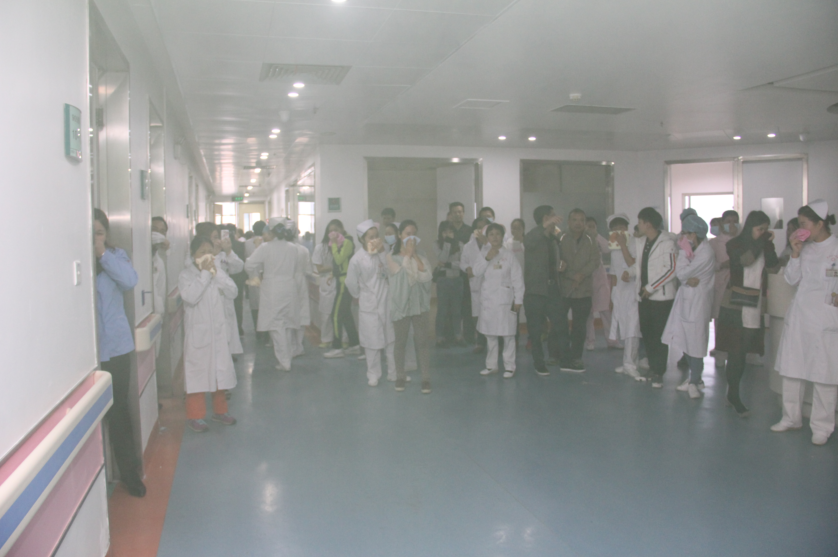 本次演习假设起火位置在3号楼9层,烟感探测器发出火警信号后,科室医务人员拨打总机3333至消防中控报火警,孙副院长和保卫科叶科长接到报警后立刻到达消防中心担任灭火总指挥,现场指挥部迅速组织灭火。当总指挥下达疏散命令后,火场区域及上下两层连续播放三次消防广播,通过安全出口有序地进行人员疏散。抢救组对着火区域进行搜救,急诊医疗救护组使用担架、轮椅将伤者疏散,由联络组向总指挥报告疏散撤离完毕。演习完成后,全体人员在后院停车场集合,进行消防灭火器实操练习,确保全员熟悉灭火器操作方式,并由孙副院长进行总结讲评。