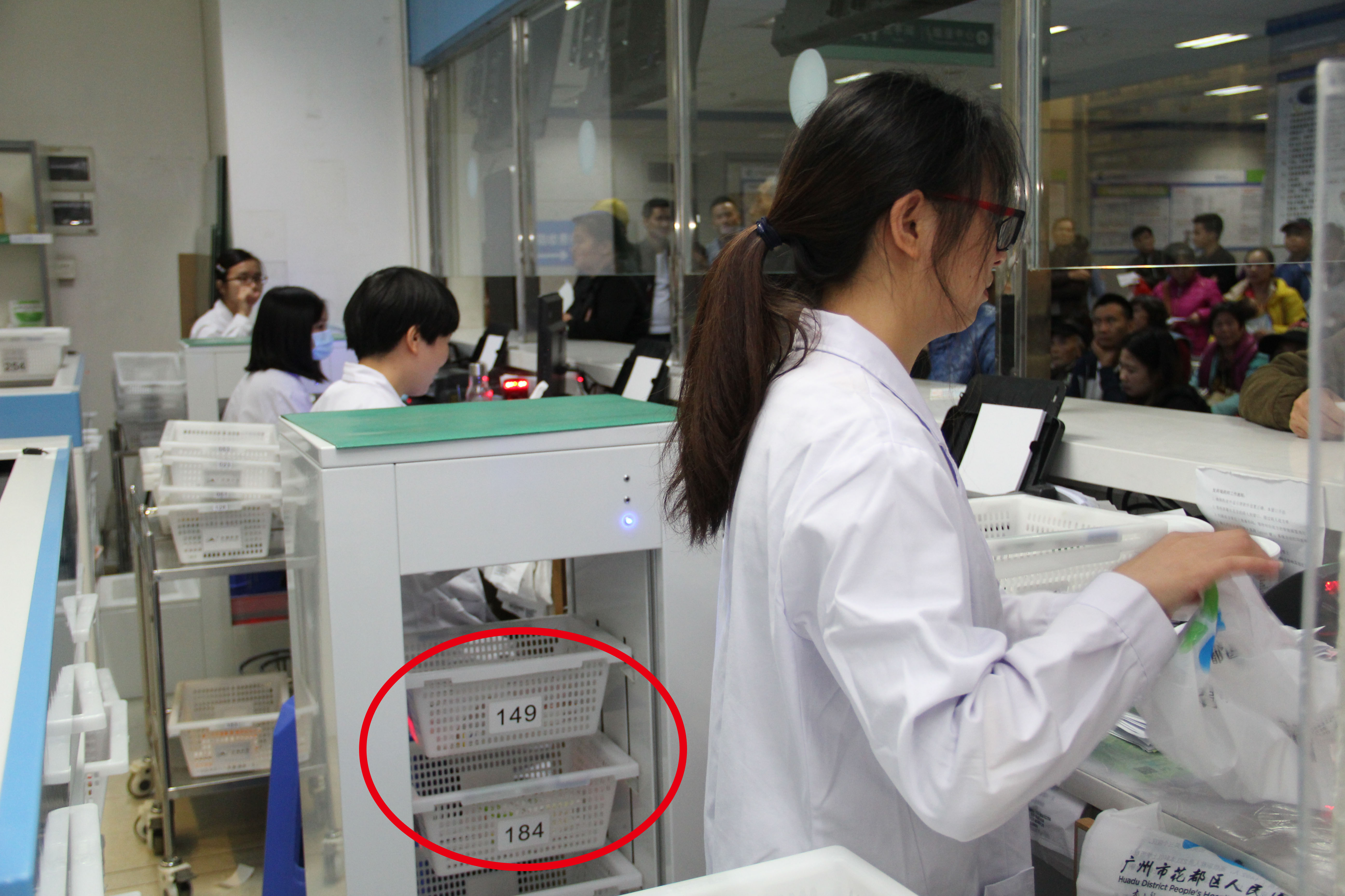 (当扫描患者处方或就诊卡时,相应的智能药篮会发出亮灯闪烁,提示药师)