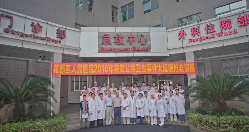 为检验医院医疗应急系统对突发公共卫生事件大规模抢救应急处置能力、院内外整体协调能力,并通过实战演练发现问题、及时改进,在经过周密设计演练方案、预先进行桌面演练及相应准备工作后,2016年11月16日,广州市花都区人民医院组织开展了突发公共卫生事件大规模抢救演练。