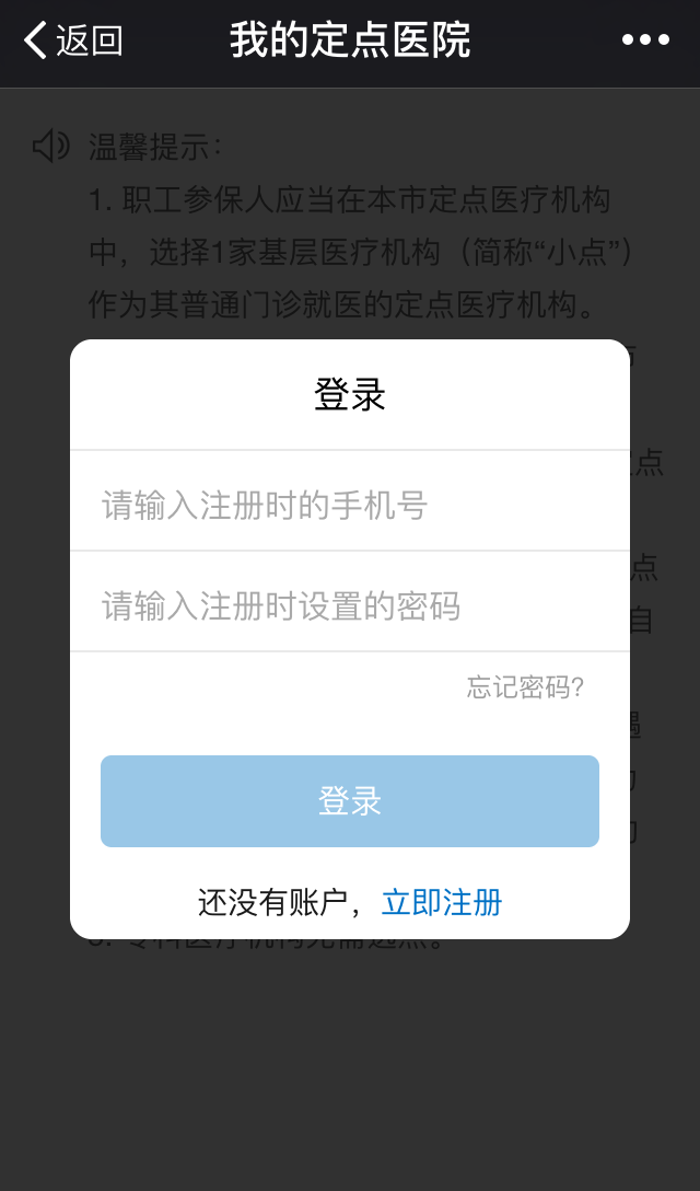 温馨提示: 职工医保参保人可以选择一家二级以上医院(“大点”)和一家基层医院(“小点”)来作为自己的选点定点医院,但必须先选“小点”,再选“大点”。