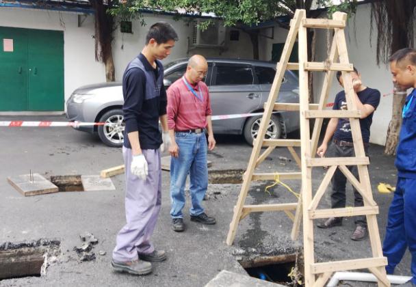 发现问题,立即排查,初步确定为沉淀池管道堵塞。在求助了两家专门处理污水维修的环保科技公司都无果的情况下,我院休假中的污水管理员们都紧急赶回了医院。经过讨论后,在保证安全、防护设备齐全的前提下,三个刚上岗几个月的新员工决定亲自下去沉淀池,尝试疏通管道。