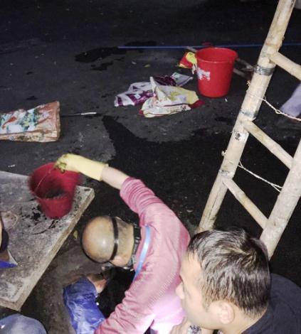 下午2点钟,正是当天最热的时候,三个工作人员开始把堵塞在管道内的沙石一桶一桶往地面运。这些本身对污水起着净化作用的沙石,经过长年累月的堆积,反而变成了堵塞管道的“罪魁祸首”。工作人员就这样靠自己的双手,重复着同样的动作,毫无怨言地一直持续工作到晚上11点,据统计,运出的沙石多达2吨。