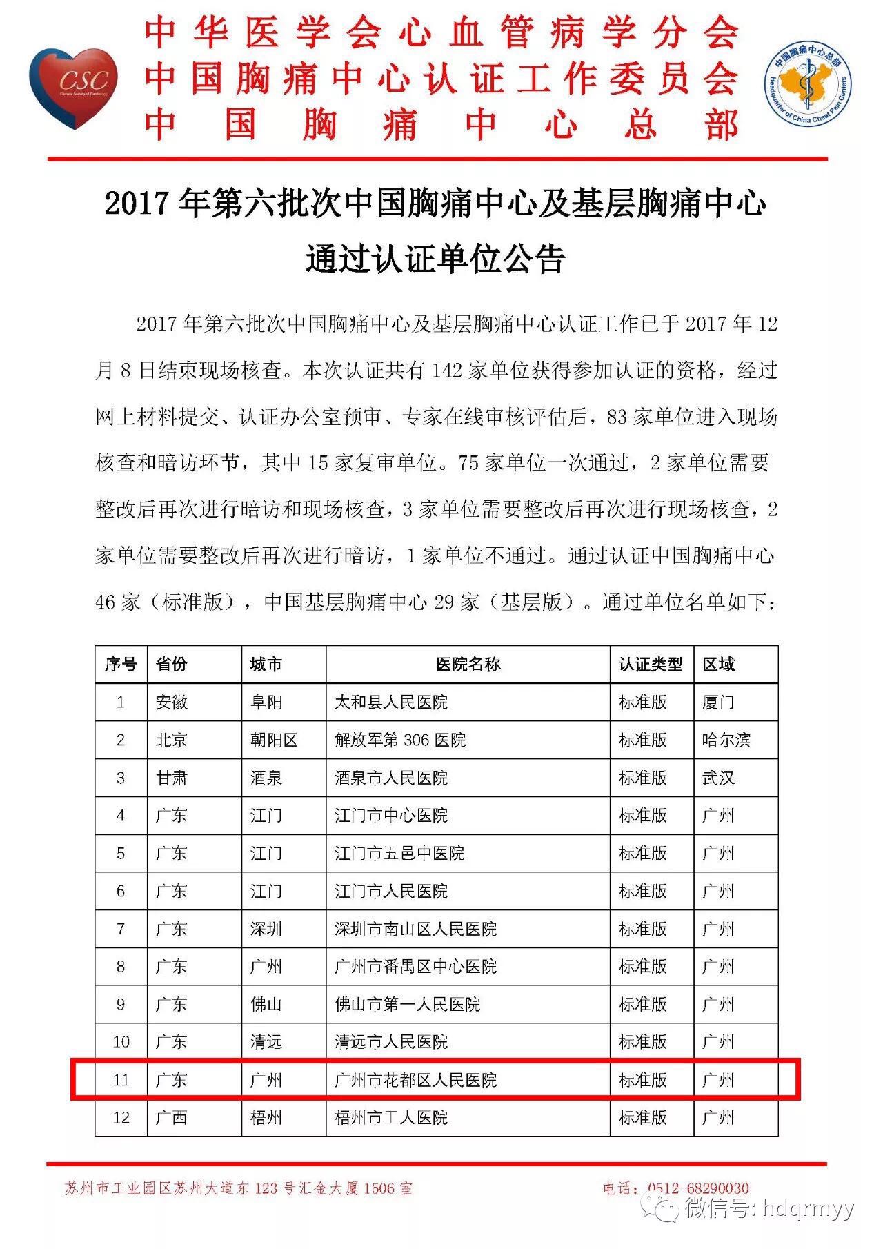 2017年12月14日,根据中国胸痛中心网公布,广州市花都区人民医院成功通过中国胸痛中心认证,成为花都区唯一一家获得“国家级标准版胸痛中心”认证的三甲综合医院。
