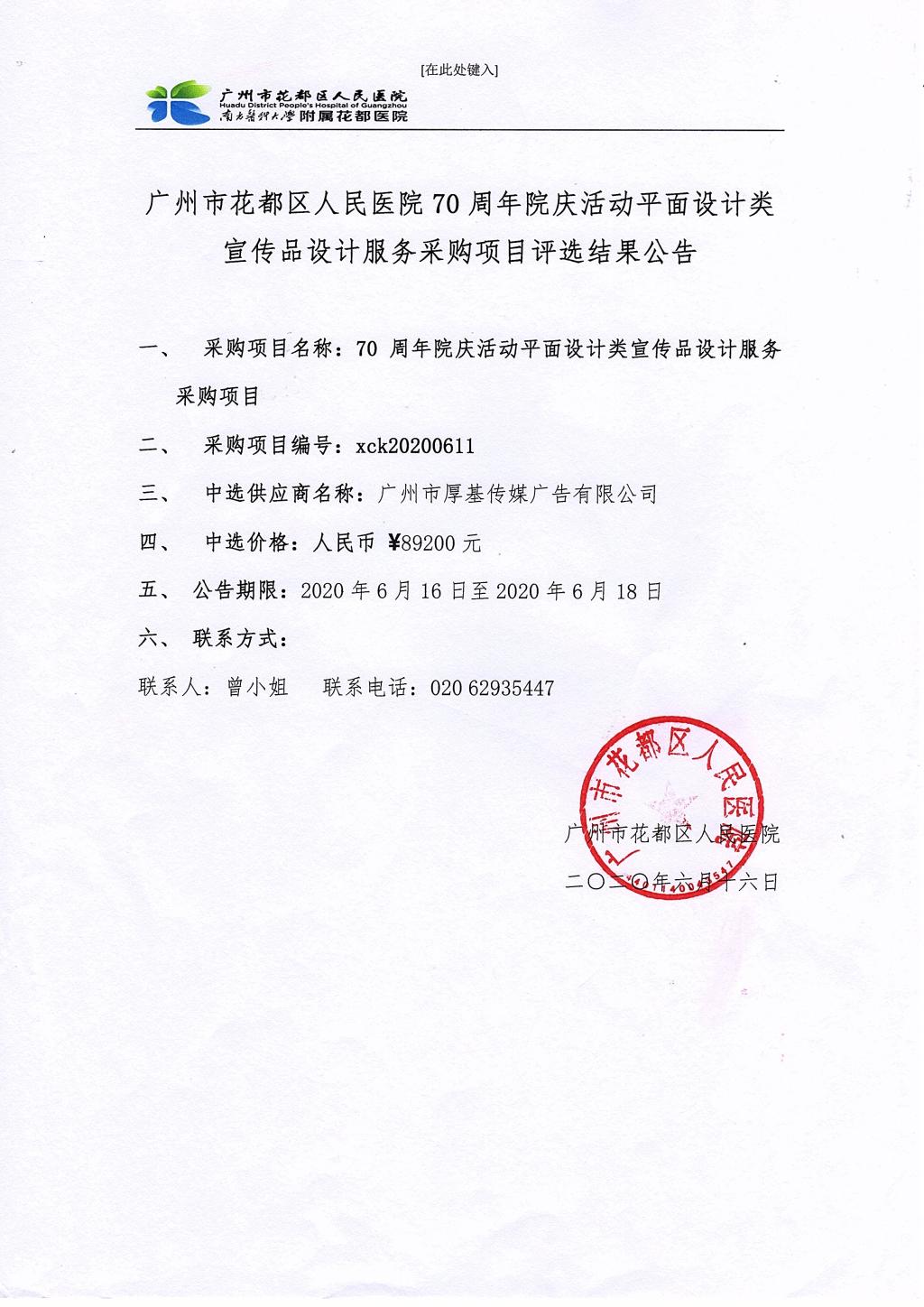 广州市花都区人民医院70周年院庆活动平面设计类宣传品设计服务采购项目评选结果公告