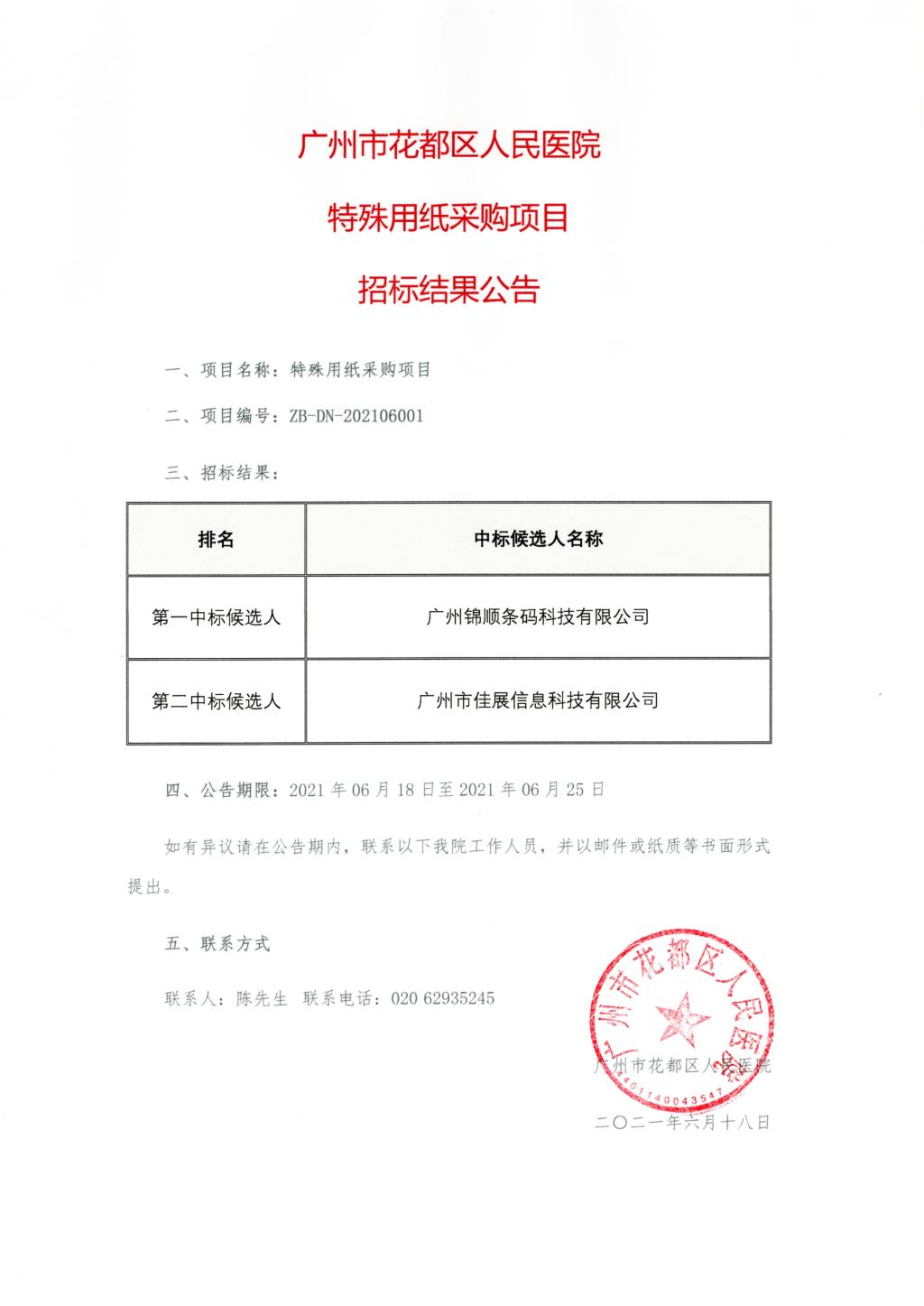 广州市花都区人民医院特殊用纸采购项目招标结果公告