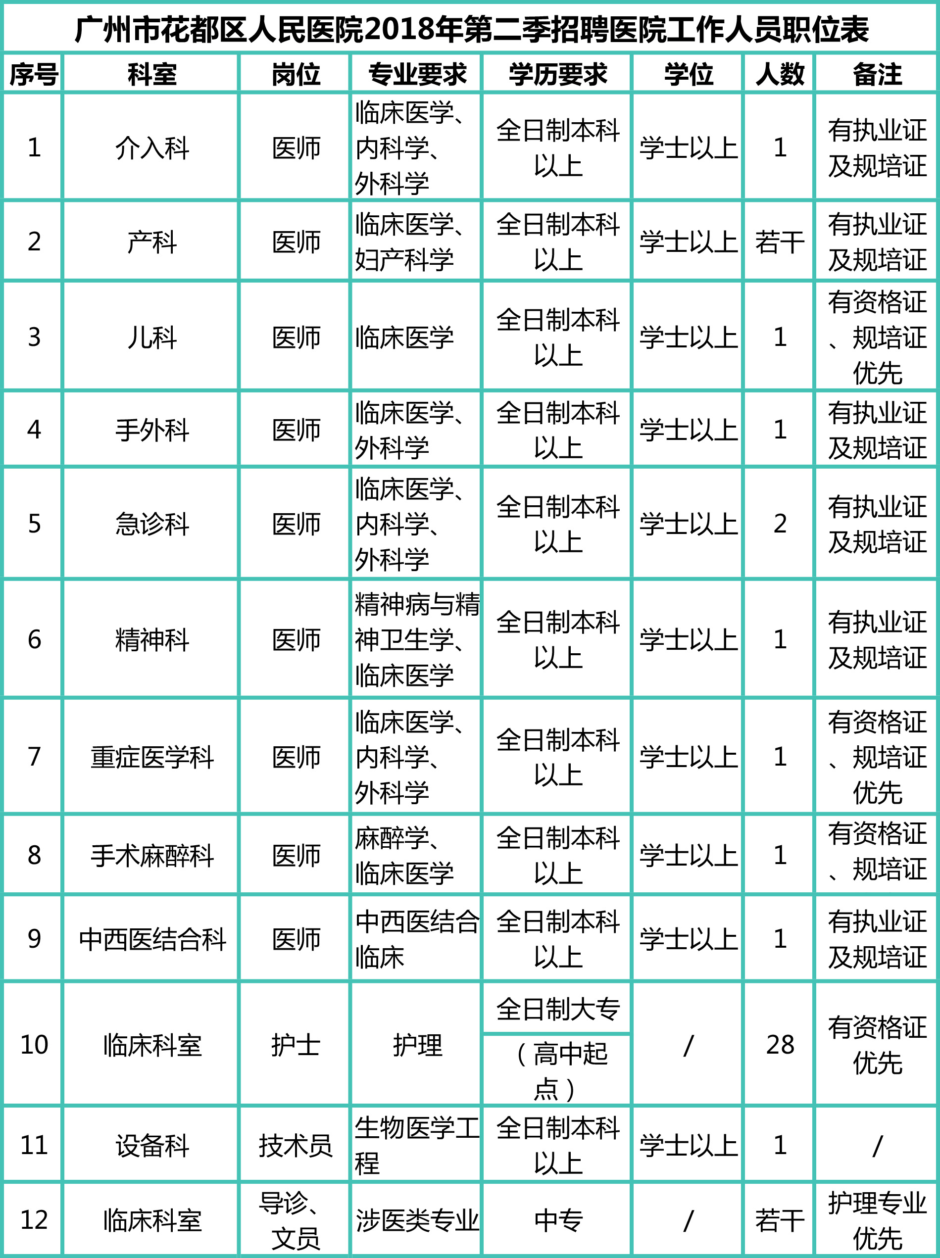 按《广州市花都区人民医院2018年第二季招聘医院工作人员职位表》。