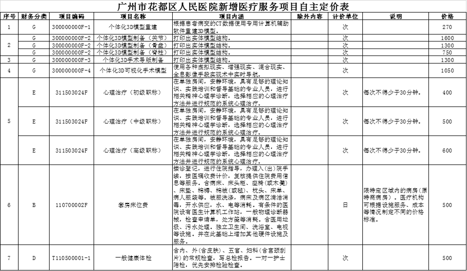根据穗发改规字〔2018〕11号文件规定“新增医疗服务价格项目审核立项后,由医疗机构自主制定试行价格”以及粤医保规〔2020〕6号文件《广东省医疗保障局关于公布部分医疗服务价格项目的通知》等,我院拟对文件中“个体化3D模型重建”等项目进行定价(具体见附件1:广州市花都区人民新增医院医疗服务项目一览表)。如有疑问请与财务科联系。联系电话:020-66355123。