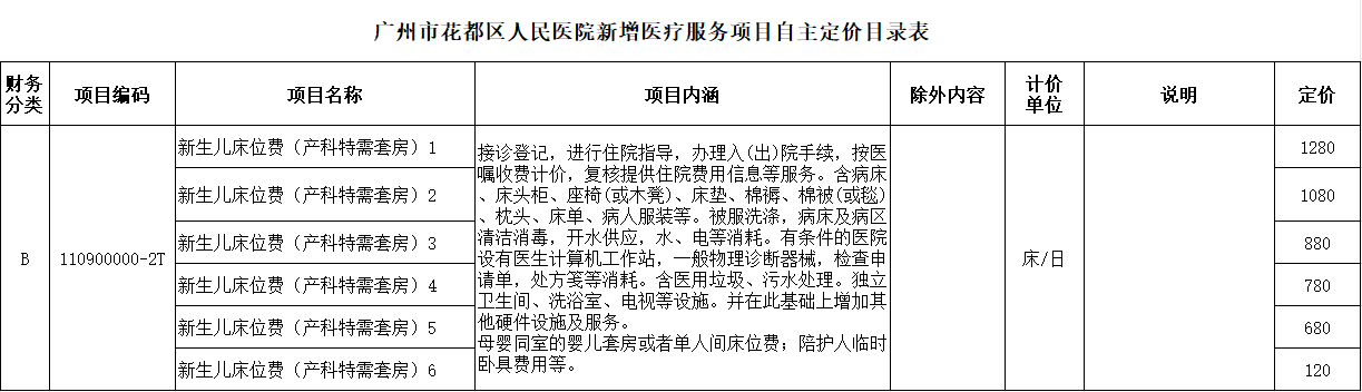 根据《广东省医疗保障局特需医疗服务项目和价格管理办法》(粤医保发〔2023〕7号)文件精神,为了满足不同患者个性化需求,我院按照公开透明、合法合理、诚实信用的原则,制定新生儿床位费(产科特需套房)收费标准(全自费),现公示如下: 广州市花都区人民医院 2024年12月26日